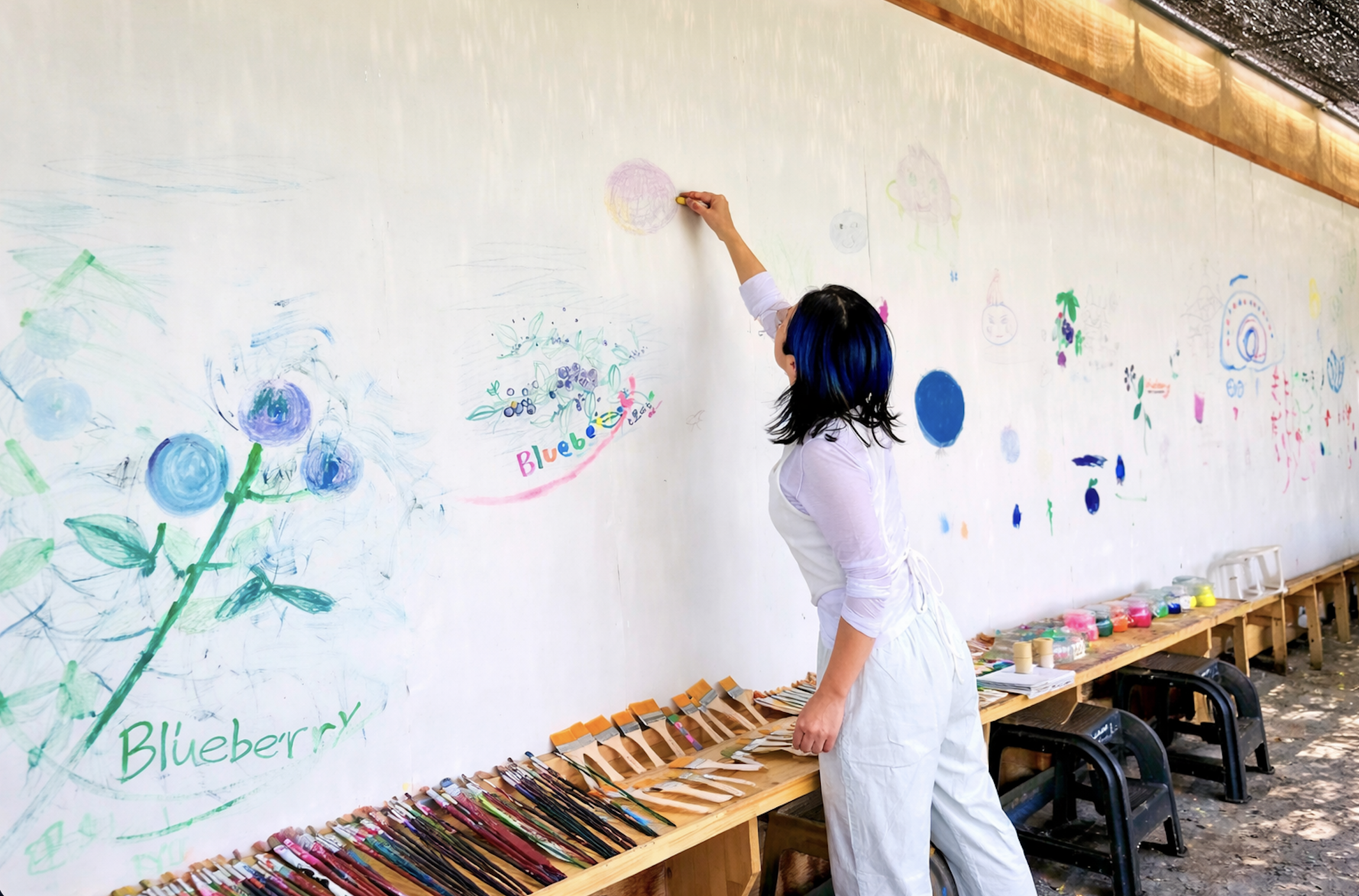 好きな色を選んで、好きな筆を手に取り、好きな場所に描いていく。ブルーベリーの実や、今日見た景色、感じたことを、自由に。そんな時間を楽しんでいただけるよう、3m×11mの大きなキャンバスをご用意しています。その時間が、“イマ・ココ”を楽しむきっかけになりますように。上手に描く必要はありません。思いのままに、自由にお楽しみください。もちろん、お子さまも一緒に楽しんでいただけます。
